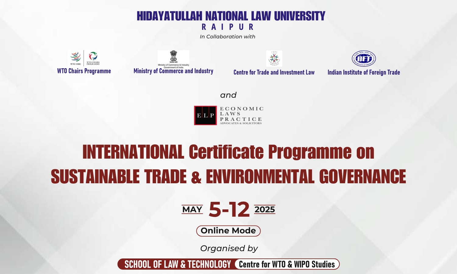 Hidayatullah National Law University, Raipur through its Centre for WTO & WIPO Studies, School for Law and Technology and in collaboration with CTIL, IIFT, the Ministry of Commerce and Industry, and ELP, under the WTO Chairs Programme is set to organise International Certificate Programme on “Sustainable Trade & Environmental Governance” from 5-12 May 2025 in online mode.
