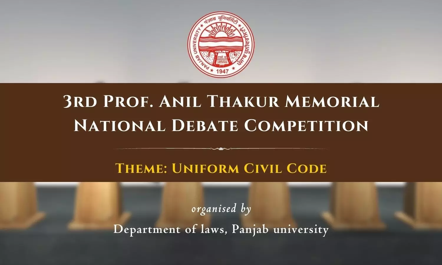 Department of Laws, Panjab University is delighted to announce the 3rd Prof. Anil Kumar Thakur Memorial National Debate Competition on the theme Uniform Civil Code (Should be or Should not be), scheduled to be held on 18th October 2023.
