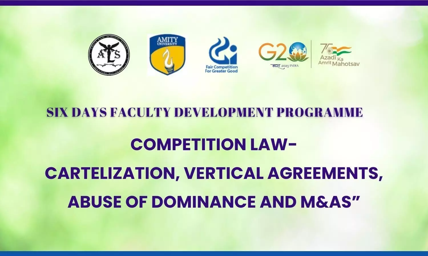 Amity Law School, Noida, (AUUP) under the aegis of the Competition Commission of India (CCI) is organising a Six Day Faculty Development Programme on the Theme “Competition Law - Cartelization, Vertical Agreements, Abuse of Dominance and M&As” which will be held from 6th September to 11th September, 2023 in a hybrid mode.