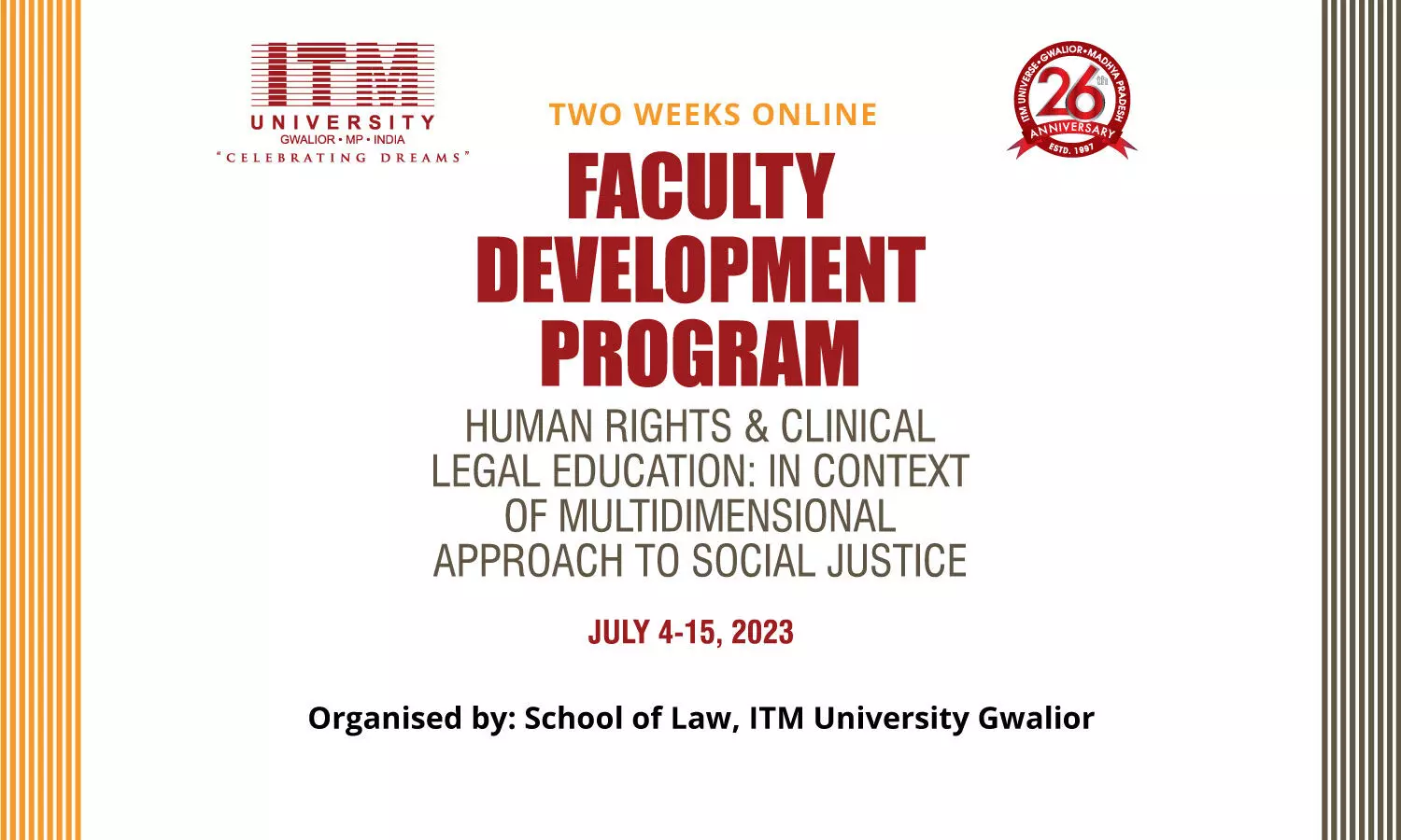 School of Law, ITM University Gwalior is organising two weeks on-line Faculty Development Program on Human Rights and Clinical Legal Education: In Context of Multidimensional Approach to Social Justice from 4th July 2023 to 15th July 2023.