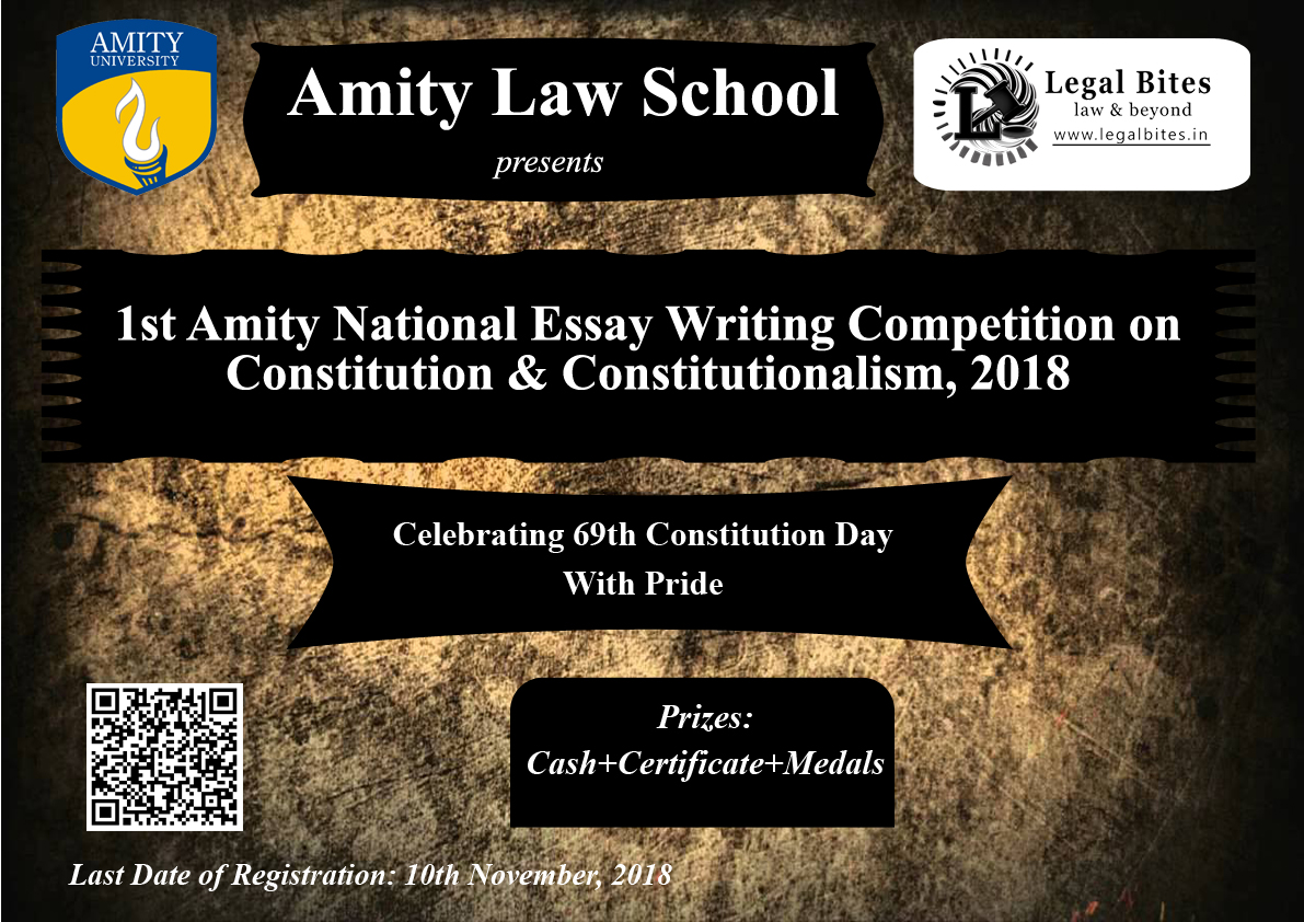 Amity Law School Gurugram in Collaboration with Legal Bites is Organising its 1st National Essay writing Competition on Constitution & Constitutionalism 2018 on the auspicious day of 26th November 2018 i.e. Constitution Day. It is a competition designed to inculcate literary skills among the students. The topics of articles are propounded by some known academicians.