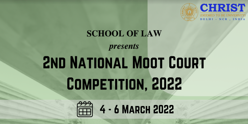 It gives me immense pleasure to inform you that the School of Law, CHRIST (Deemed to be University) Delhi NCR, is organizing the 2nd National Moot Court Competition, 2021 to be held from 4th March to 6th March, 2022. We are thrilled to invite your prestigious institution to participate in the competition and grace us with your presence.