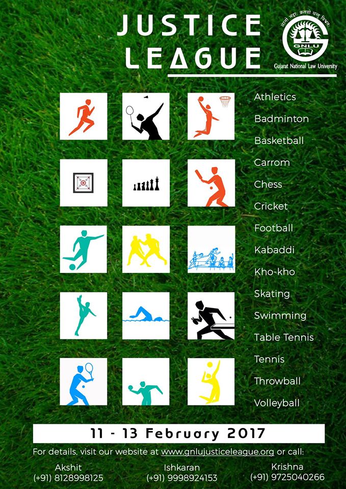 The sporting fraternity at GNLU eagerly awaits your participation, please do come and be a part of the zealous celebration of sports and sportsmanship that will be Justice League 2017!