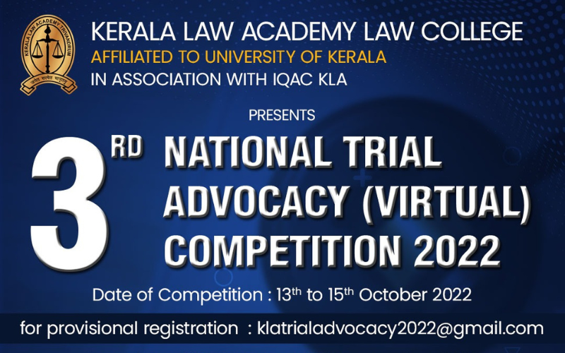 Kerala Law Academy is organizing its 3rd KLA National Trial Advocacy Competition (Virtual), 2022 scheduled to be held from October 13th to 15th, 2022.