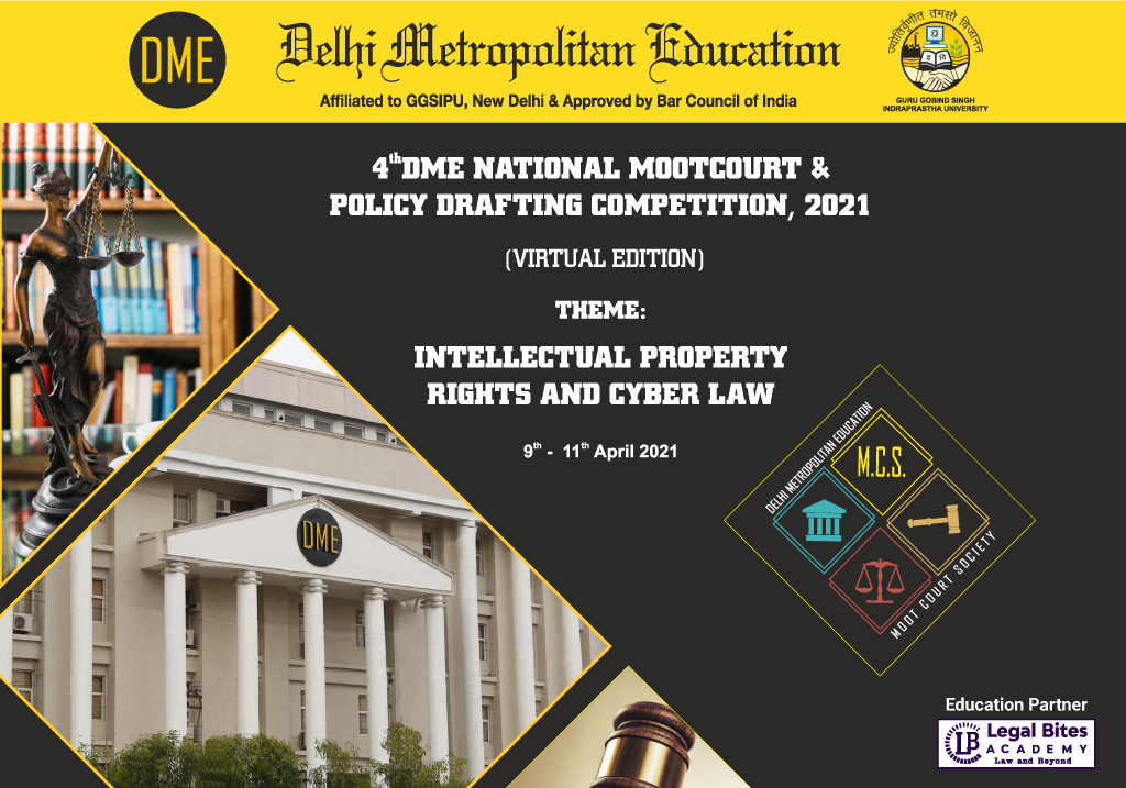 We are elated to announce our 4th DME National Moot Court and Policy Drafting Competition which is scheduled to be held on 9-11 April 2021 through online platforms. Sitting Judges, Practising Advocates, Academicians, and Experts in the field of law shall be invited to adjudicate the competition.