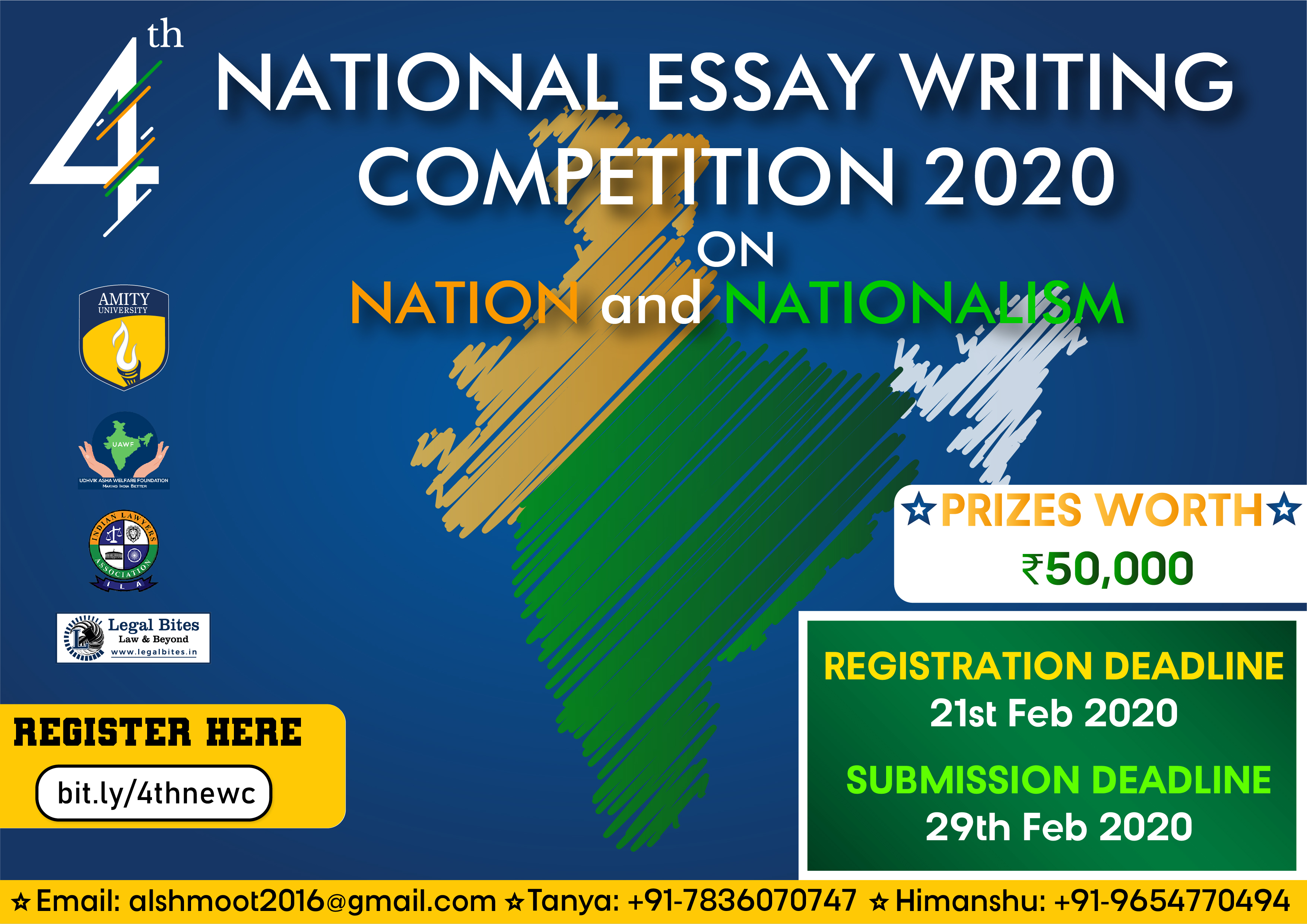 About the Competition Amity Law School is proud to announce the Fourth Edition “National Essay Writing Competition on Nation and Nationalism 2020”, in association with Indian Lawyers Association, Udhvik Asha Welfare Foundation and Legal Bites. The objective behind this initiative is to help the youth understand the importance of nationalism and to incite creativity in their young minds that could translate their patriotism to words on paper. Theme of the Essay Nation and...