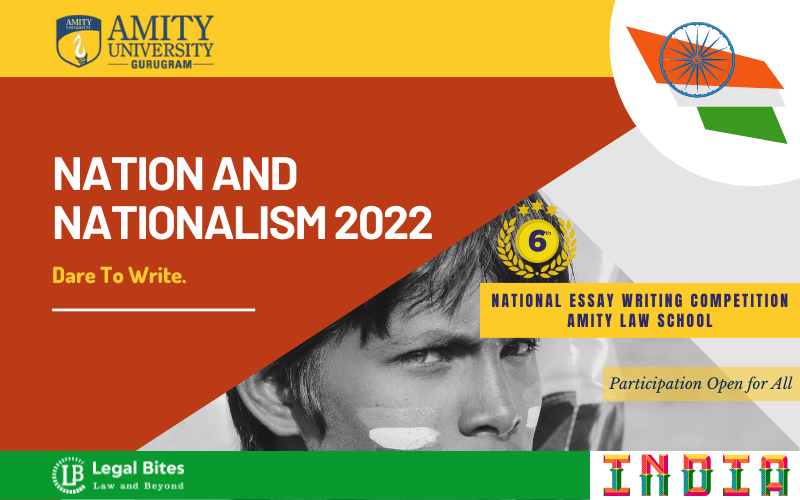 Amity Law School is organizing the 6th edition of its acclaimed “National Essay Writing Competition on Nation and Nationalism 2022” in collaboration with Legal Bites. The Competition offers the students the opportunity to elaborate on their ideals of nationalism, nation-building and the overall socio-economic growth of the nation. The aim is to promote the ideals of nation and nationalism in its true sense where the head is held high and each individual respects and appreciates the diversity and strives for collective success.