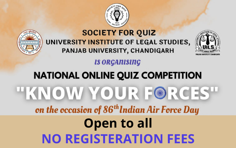 Air Force day National quiz competition will be organised by The Society for Quiz, University Institute of Legal Studies, Panjab University, on October 8, 2021 (round-1) under the guidance of Prof. (Dr.) Rajinder Kaur, Director, University Institute of Legal Studies, Panjab University, Chandigarh and Dr. Pushpinder Kaur, Associate Professor (Law), University Institute of Legal Studies, Panjab University, Chandigarh.