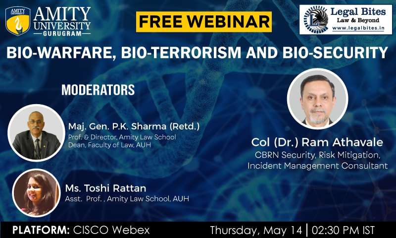 Amity Law School Gurugram is organising a webinar on “Bio-Warfare, Bio-Terrorism, and Bio-Security”. The speaker for the webinar is Col. (Dr.) Ram Athavale, CBRN Security, Risk Mitigation, Incident Management Consultant.