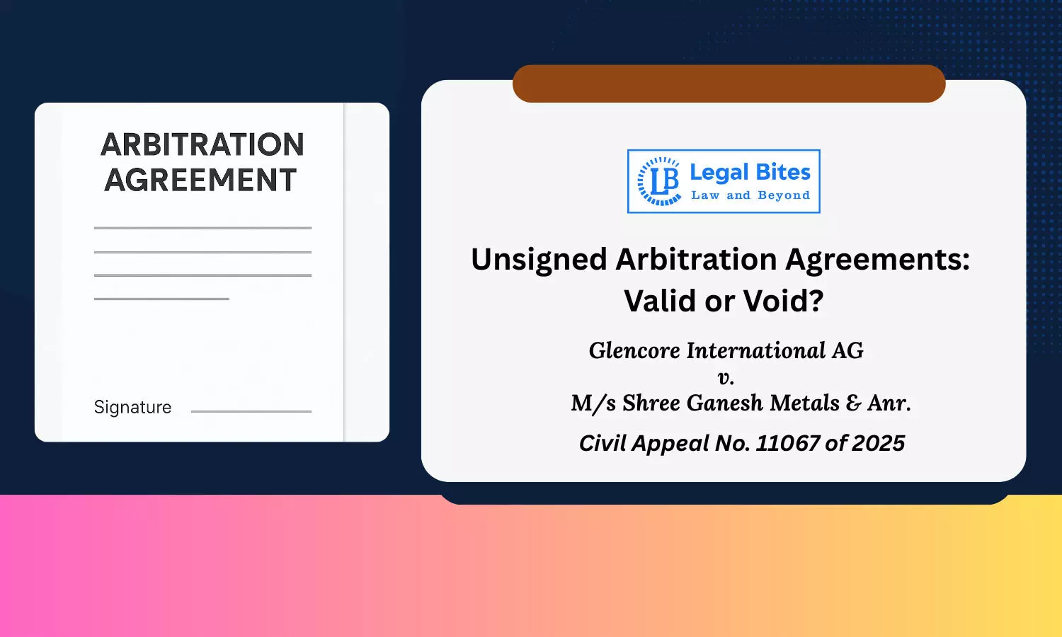 The Supreme Court of India, in its August 2025 decision in Glencore International AG v. M/s Shree Ganesh Metals & Anr., decisively addressed this question. The Court clarified that signatures are not indispensable where parties’ conduct clearly demonstrates consent. This article examines the legal principles governing unsigned arbitration agreements, the facts and reasoning of the Glencore judgment, and its implications for Indian and international arbitration law.