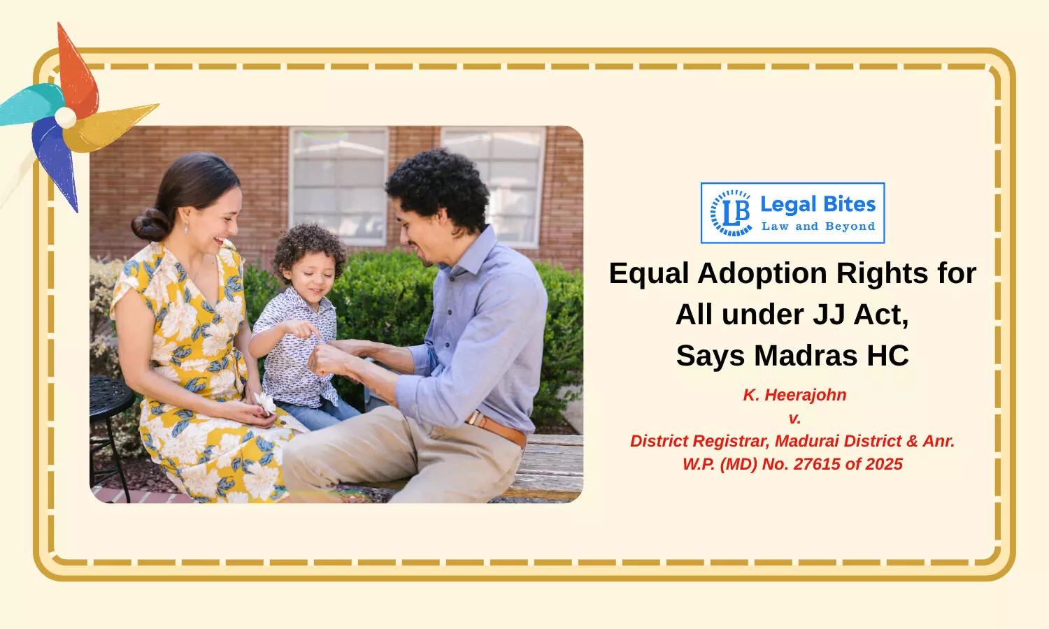 In a landmark judgment reaffirming that statutory adoption rights transcend religious boundaries, the Madras High Court in K. Heerajohn v. District Registrar, Madurai District & Anr. [W.P. (MD) No. 27615 of 2025, decided on 17 October 2025] held that adoption under the Juvenile Justice (Care and Protection of Children) Act, 2015 (JJ Act) is uniform and secular in nature, not constrained by any personal law.