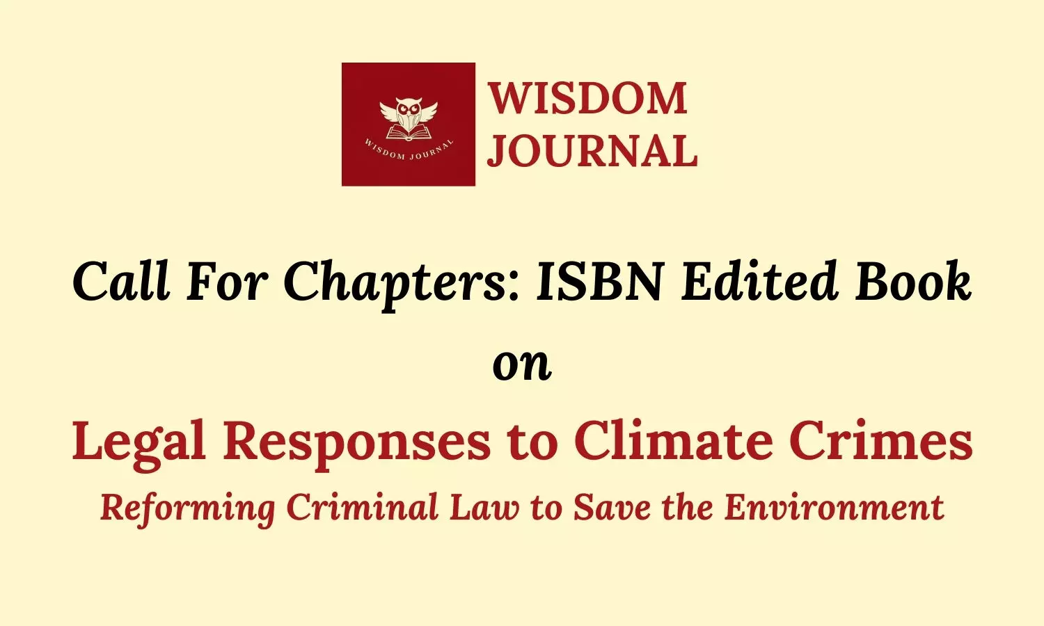 Wisdom Journal is inviting high-quality original research contributions for an edited ISBN Book on Legal Responses to Climate Crimes: Reforming Criminal Law to Save the Environment from academicians, advocates, judges, researchers, and policy professionals to be part of this important scholarly initiative.