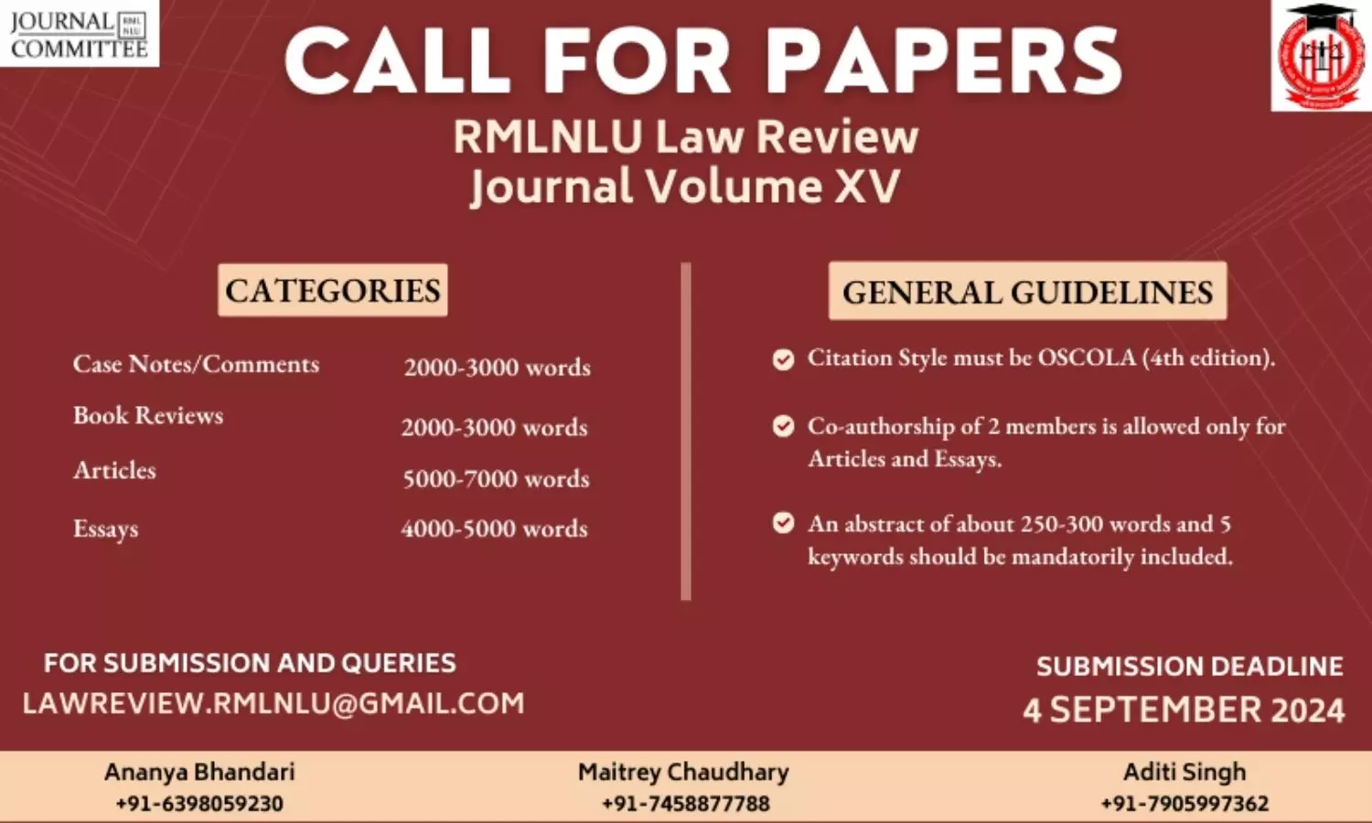 RMLNLU Law Review Journal is inviting submissions for its upcoming volume. Scroll down for more details!;