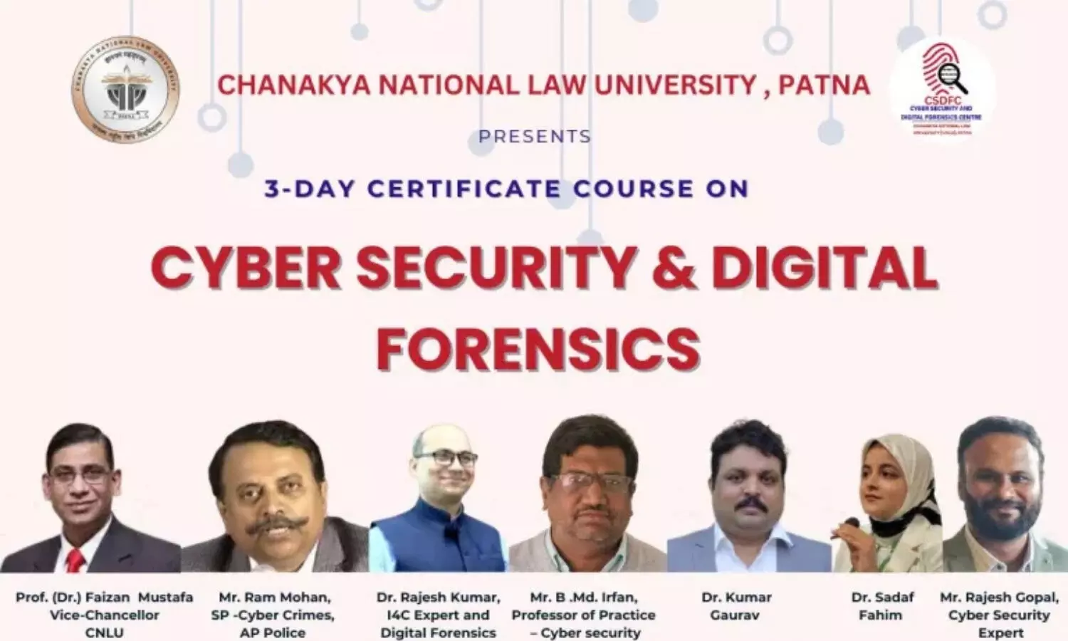 - Location for In-Person mode: Cyber Forensics Lab, Cyber Security and Digital Forensics Center - CSDFC, CNLU Campus, Patna.