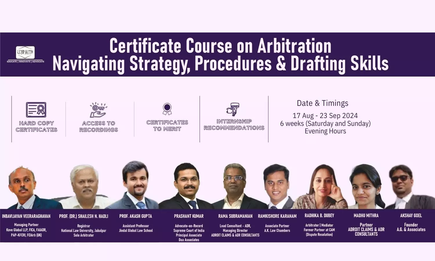 The Course is open to a diverse audience, including law students, lawyers, law firm associates, CA, CS, MBA professionals, and individuals from various working professions. Whether you are a legal enthusiast, educator, or professional seeking to enhance your understanding of arbitration, this course offers a valuable opportunity for skill development and knowledge enrichment.