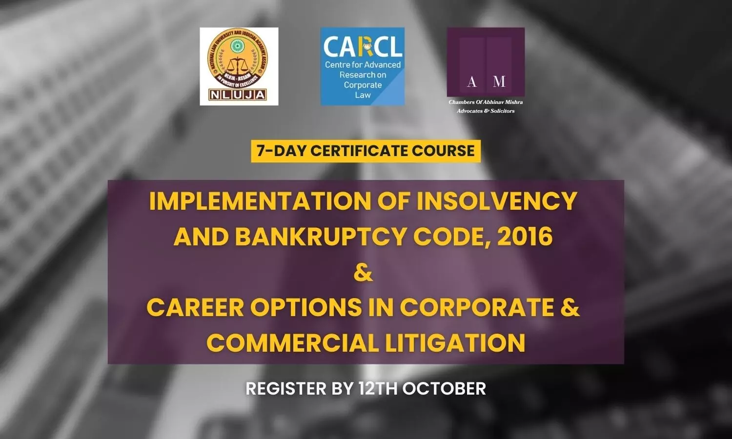 Certificate course on Implementation of Insolvency & Bankruptcy Code, 2016, and Career in Corporate & Commercial Litigation is being organised by Chambers of Abhinav Mishra, Advocates & Solicitors, in collaboration with Centre of Advanced Research on Corporate Law, National Law University & Judicial Academy, Assam from 14th October to 20th October 2023.