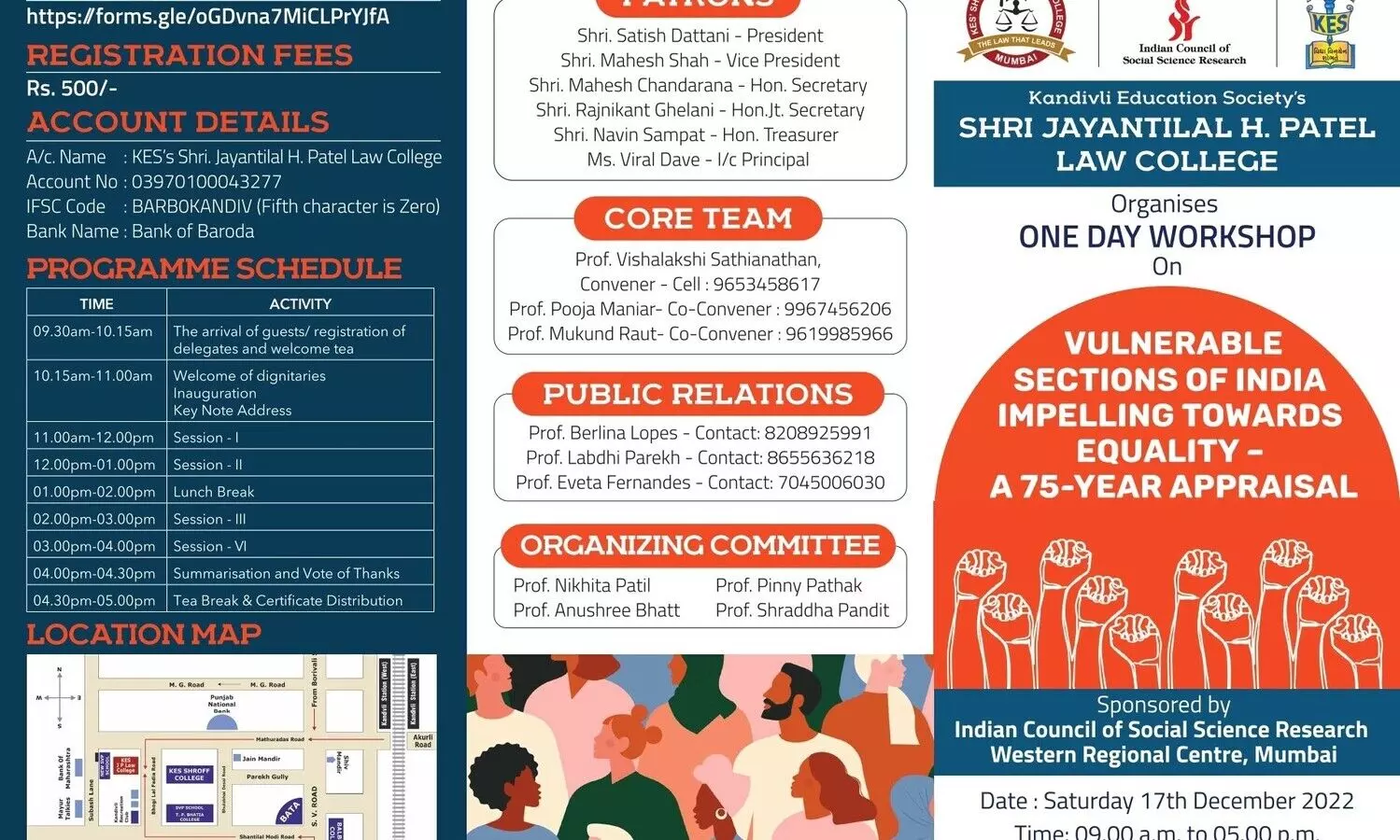 KES' Shri. Jayantilal H. Patel Law College, Kandivli (West), Mumbai is inviting to an academician centric One-Day Workshop (Offline) on "Vulnerable Sections of India Impelling Towards Equality- A 75-Year Appraisal" Sponsored by Indian Council of Social Science Research (ICSSR), Western Regional Centre, Mumbai.;