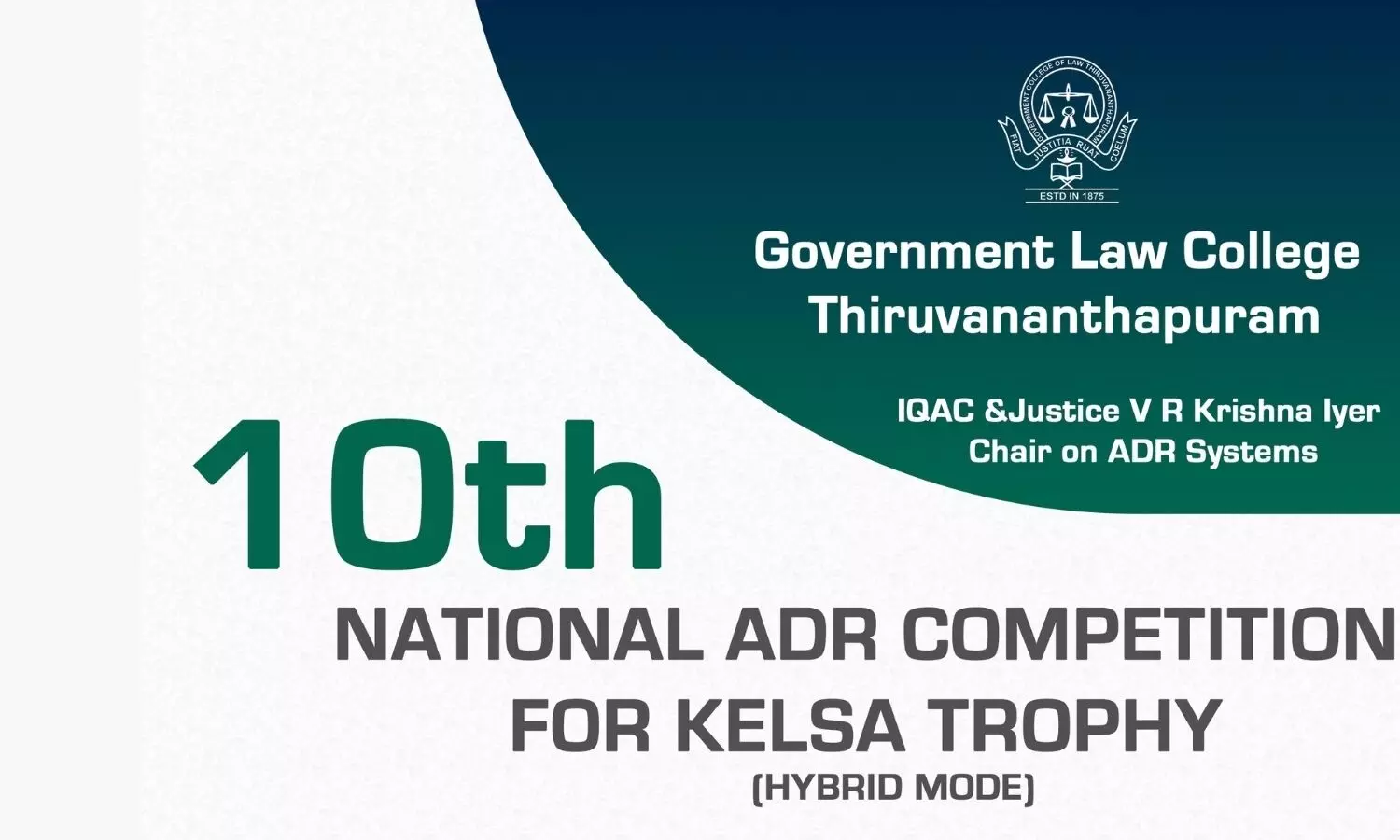 10th National ADR Competition for KELSA Trophy organized by Government Law College, Thiruvananthapuram in association with IQAC and Justice V R Krishna Iyer ADR Chair.