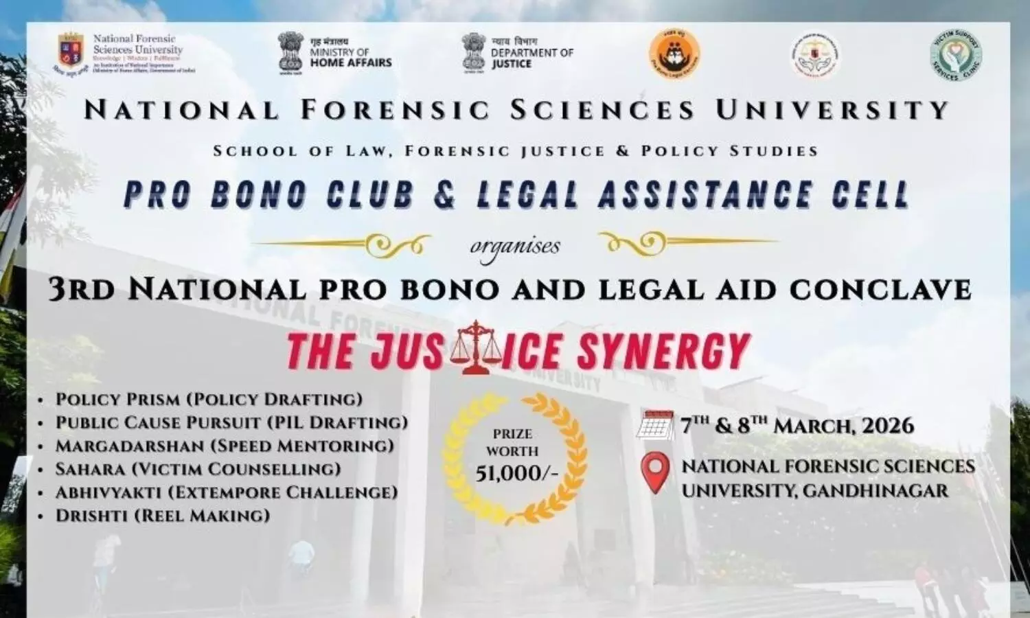 School of Law, Forensic Justice and Policy Studies, National Forensic Sciences University, Gandhinagar is organizing its 3rd National Pro Bono & Legal Aid Conclave, scheduled to be held from 07th to 08th March 2026.