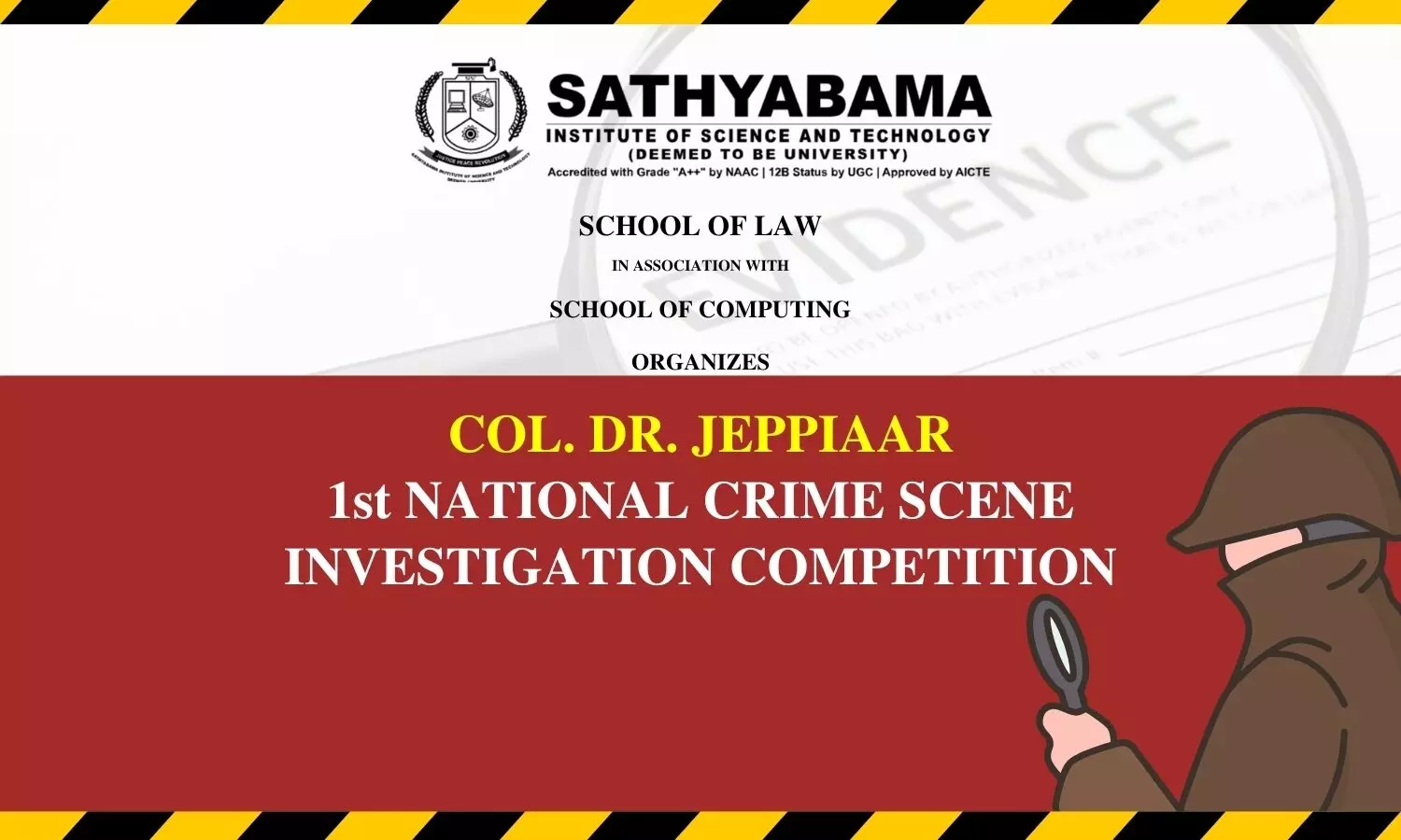 School of Law of Sathyabama Institute of Science and Technology is organizing the Col. Dr. Jeppiaar 1st National Crime Scene Investigation Competition on August 12, 2023.;