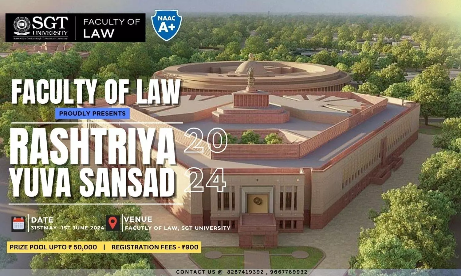 Faculty of Law, SGT University, Gurugram is hosting its 1st National Youth Parliament, Rashtriya Yuva Sansad, 2024, scheduled to be held on 31st May - 01st June 2024.