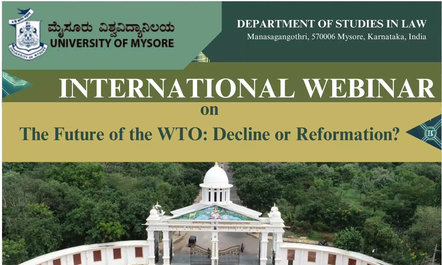 Department of Studies in Law, University of Mysore, is conducting an International webinar on "The Future of WTO: Decline and Reformation?" scheduled to be held on August 02, 2025.