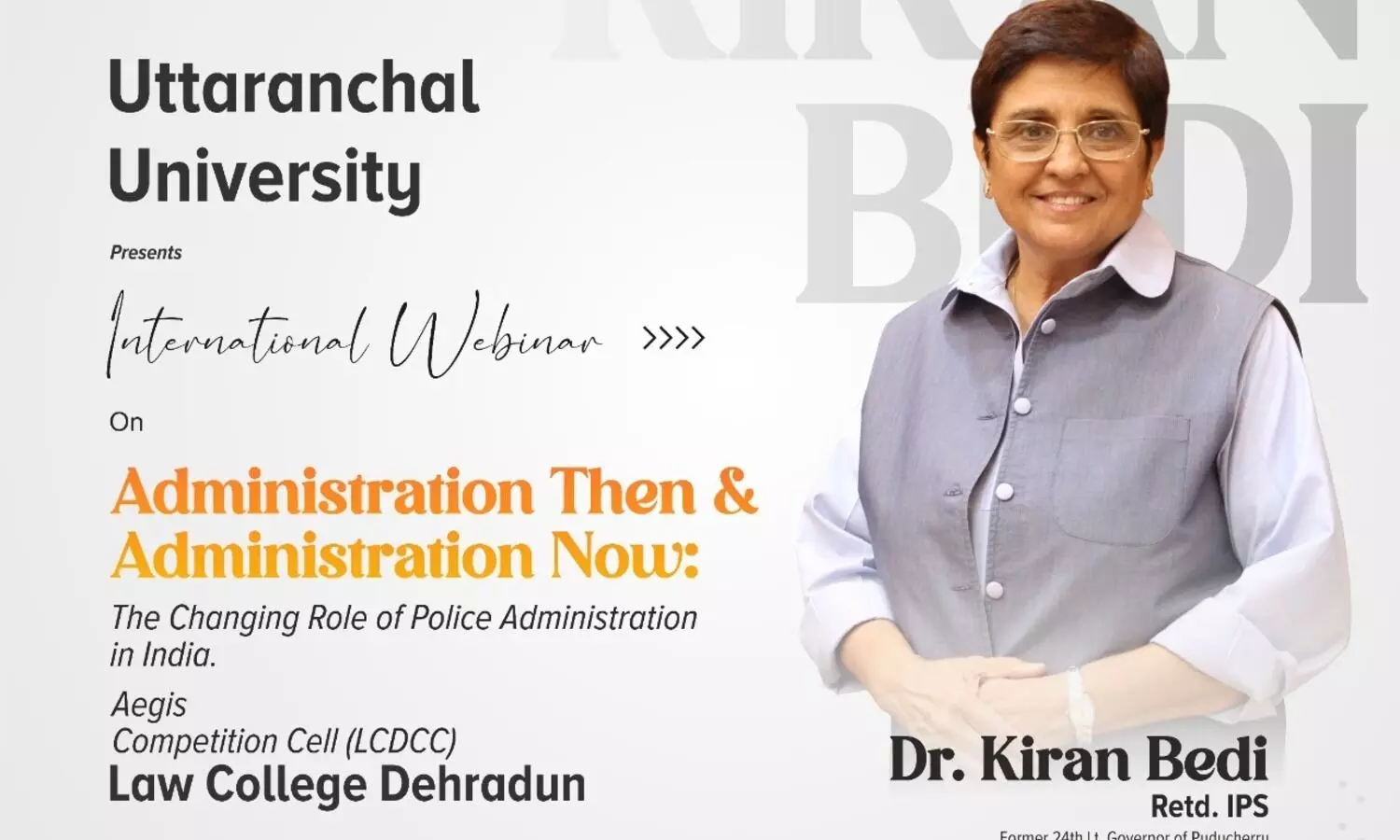 Competition Cell, Law College Dehradun faculty of Uttaranchal University, is organising an international webinar on the topic "Administration then & administration now: The changing role of police administration in India" with Dr. Kiran Bedi, Retd. IPS and the former 24th Lt. Governor of Puducherry.