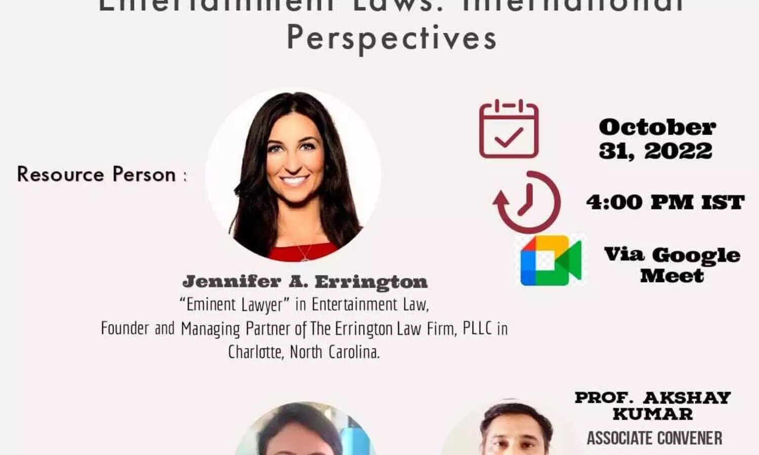 IMS Law College, Noida is organising an International Webinar on Entertainment Laws on October 31, 2022 at 4:00 PM via Google Meet.;