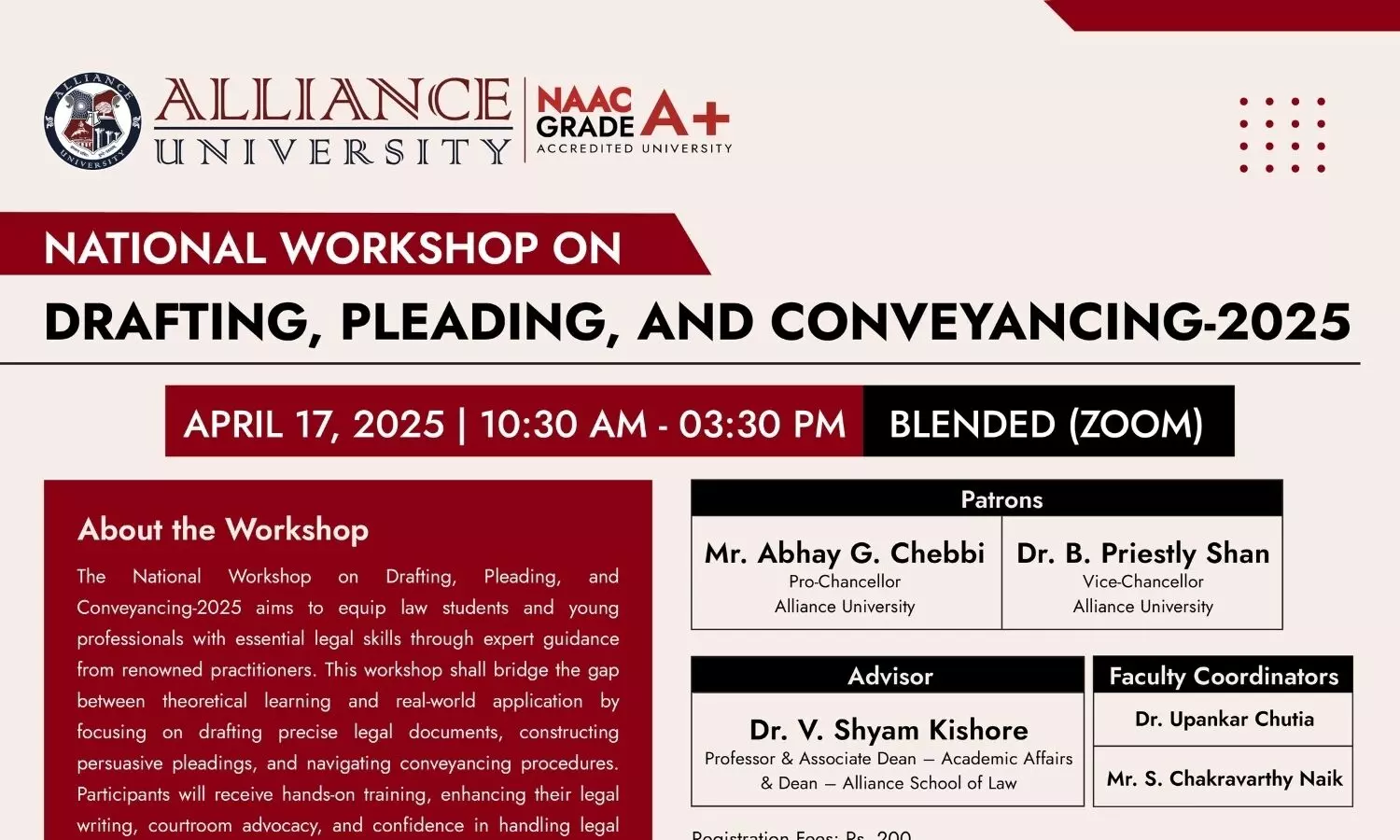 Alliance School of Law, Alliance University, Bengaluru, is organizing its National Workshop on Drafting, Pleading, and Conveyancing, scheduled to be held on 17th April 2025.