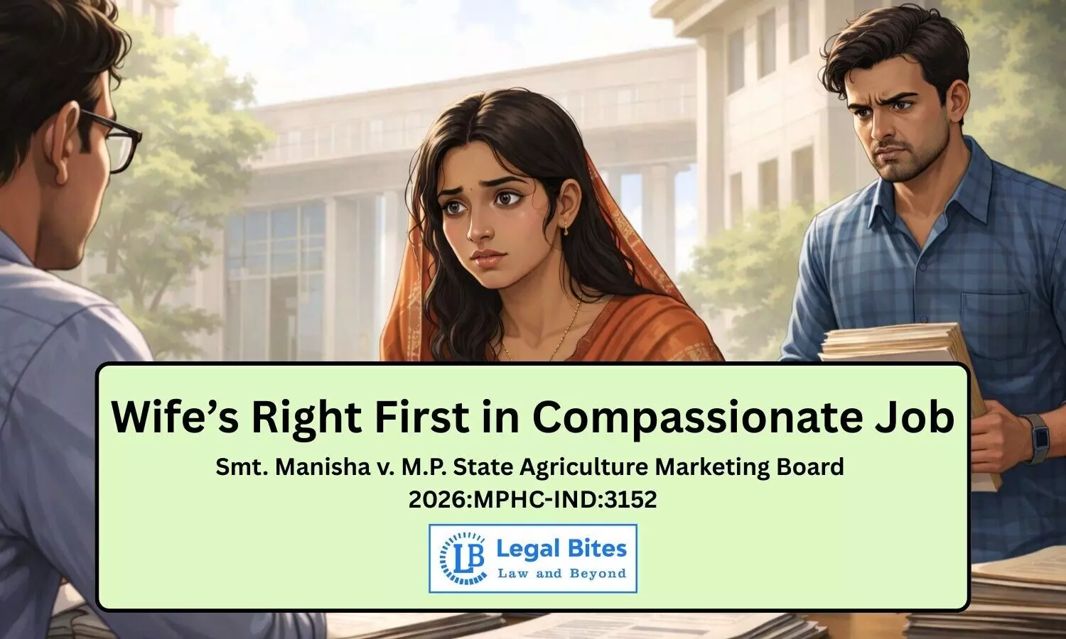 In a significant ruling, the Madhya Pradesh High Court reaffirmed that a brother of a deceased married employee cannot defeat the wife’s preferential claim to compassionate appointment. The Court further held that authorities cannot insist on a succession certificate when the policy clearly recognises the wife as the first eligible dependent. The decision in Smt. Manisha v. M.P. State Agriculture Marketing Board (2026:MPHC-IND:3152) provides crucial clarity on the scope of compassionate appointment schemes and the impermissibility of importing civil succession principles into them.