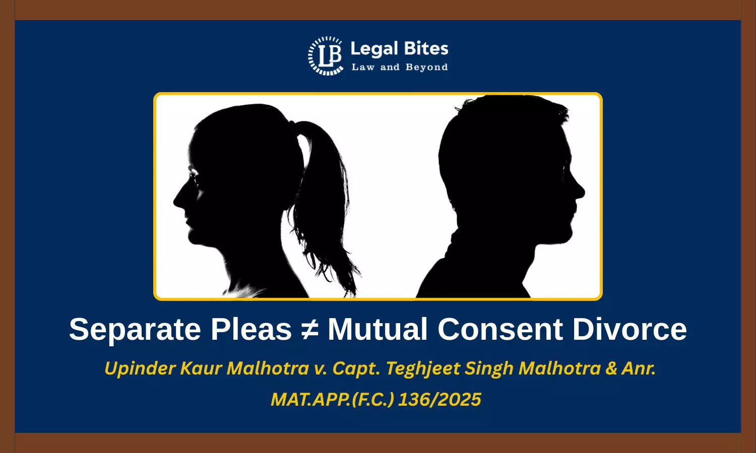 A pressing legal question has emerged in recent years: When both spouses file separate divorce petitions on fault grounds, can the court suo motu or otherwise convert those separate pleas into a decree of divorce by mutual consent? Delhi High Court recently addressed this issue in Upinder Kaur Malhotra v. Capt. Teghjeet Singh Malhotra & Anr. (24 September 2025), emphatically ruling that such conversion is impermissible in law.