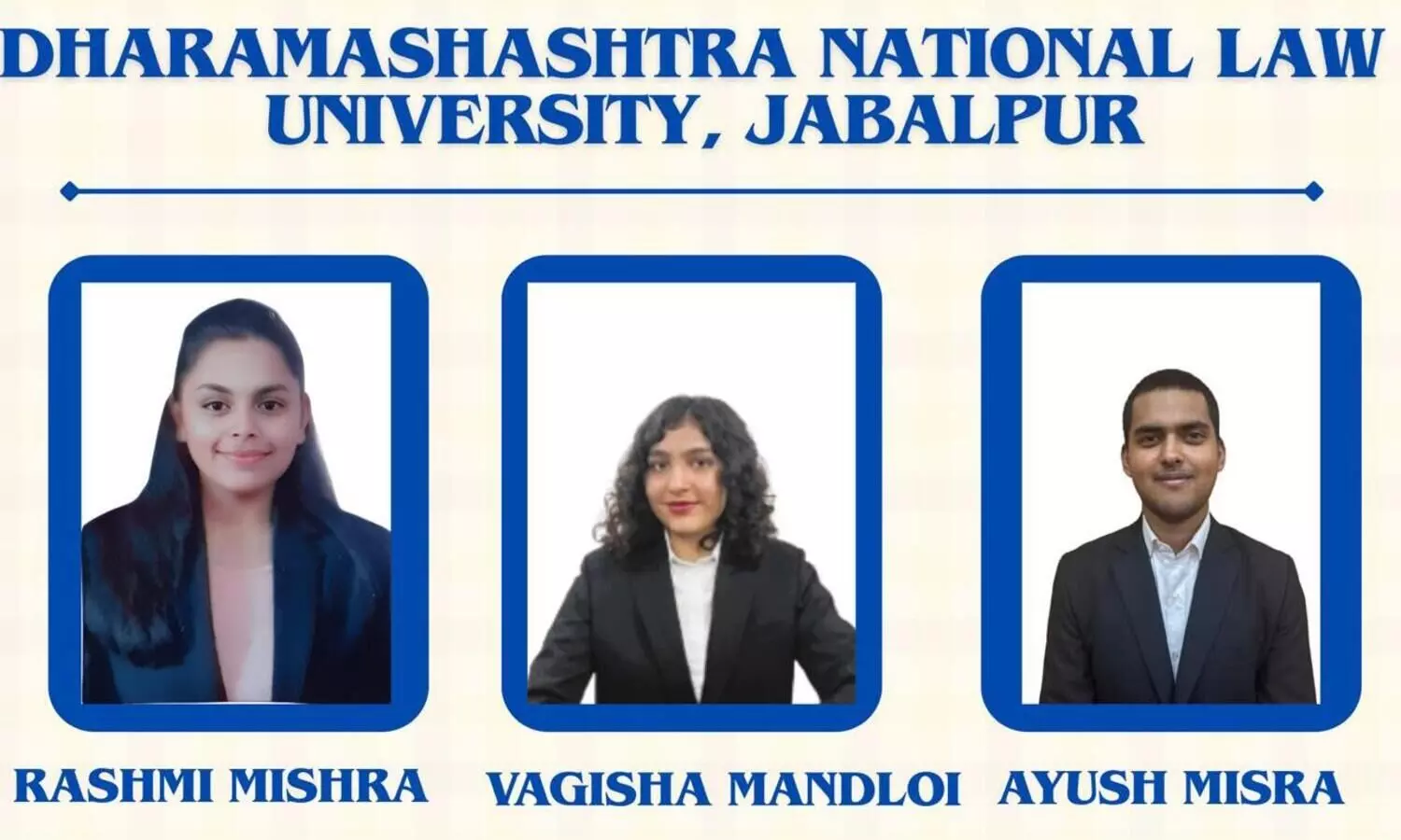 Jabalpur | May 24, 2025 — Dharmashastra National Law University (DNLU), Jabalpur proudly announces that three of its exceptional law students—Ms. Rashmi Mishra, Mr. Ayush Misra, and Ms. Vagisha Mandloi—have qualified for the World Rounds of the Nuremberg Moot Court Competition 2025, an internationally renowned event dedicated to international criminal law and human rights.