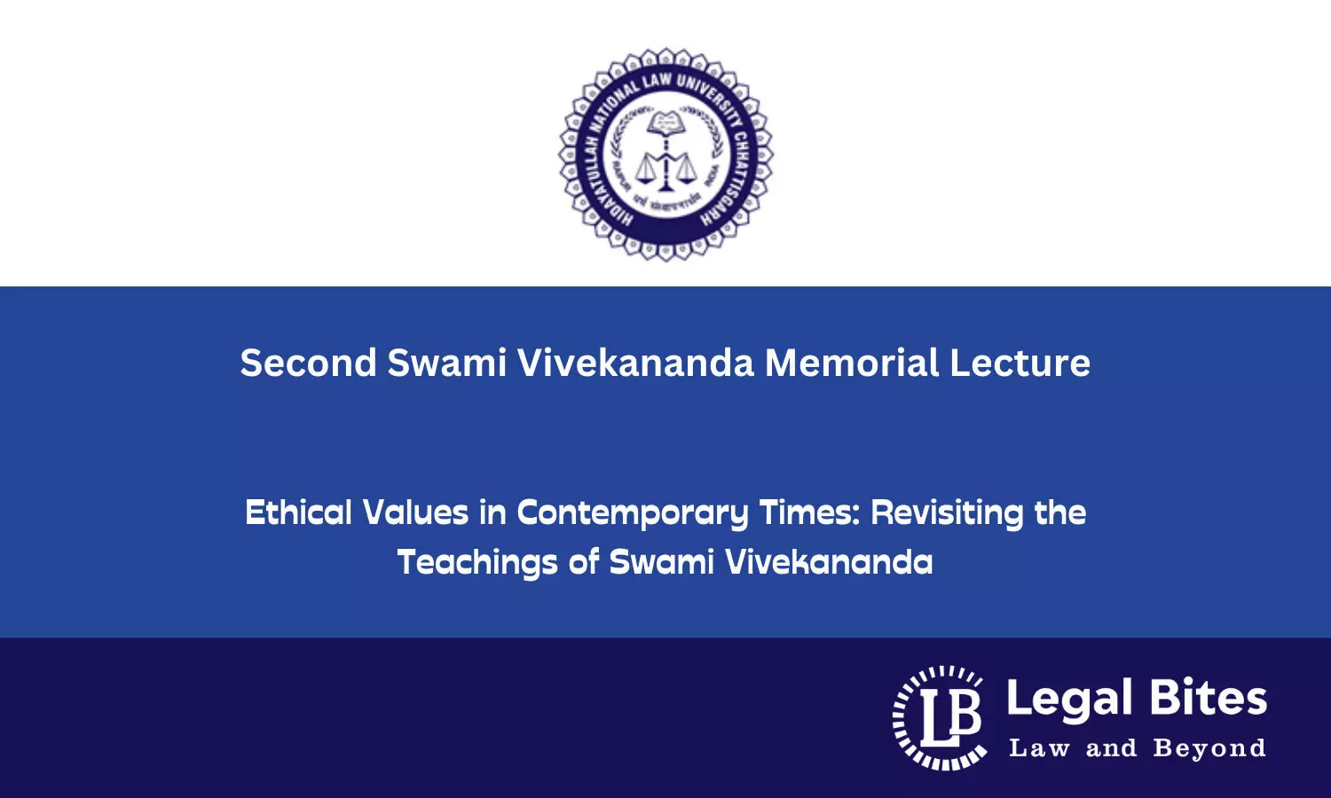 Hidayatullah National Law University (HNLU) a premier law university in the country organized Second Swami Vivekananda Memorial Lecture 2023 on January 12, 2023, at 5:30 pm on the occasion of the National Youth Day. Swami Atmapriyananda, Pro-Chancellor, Ramakrishna Mission, Educational and Research Institute was the Chief Guest for the event and spoke on the topic of 'Ethical Values in Contemporary Times: Revisiting the Teachings of Swami Vivekananda'. Opening Remarks for the programme was delivered by Prof. Dr. VC Vivekanandan, Hon'ble Vice-Chancellor, HNLU and the Concluding Remarks was delivered by Prof. Dr. Uday Shankar, Registrar, HNLU.