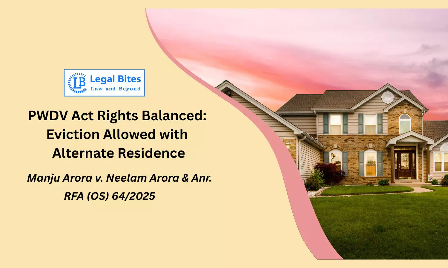 In a landmark pronouncement reaffirming the delicate balance between the rights of women under the Protection of Women from Domestic Violence Act, 2005 (PWDV Act) and the rights of senior citizens to live peacefully in their own homes, the Delhi High Court in Manju Arora v. Neelam Arora & Anr. (RFA (OS) 64/2025, judgment dated 30 October 2025) upheld the eviction of a daughter-in-law from her in-laws’ self-acquired property while simultaneously protecting her statutory right of residence by directing the provision of alternate accommodation.
