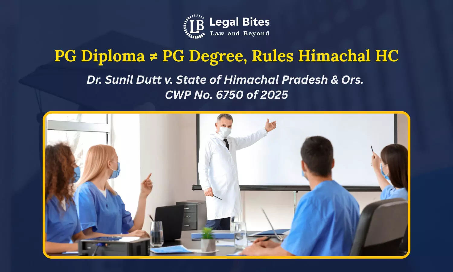The question of equivalence between postgraduate diplomas and postgraduate degrees in medical education and service promotions has long been a subject of dispute in India. In its recent judgment in Dr. Sunil Dutt v. State of Himachal Pradesh & Ors. (CWP No. 6750 of 2025, decided on 23 September 2025), the Himachal Pradesh High Court emphatically held that there is no parity between a PG Diploma and a PG Degree when it comes to eligibility for promotion to the post of Assistant Professor under the Himachal Pradesh Medical Education Service Rules, 1999.