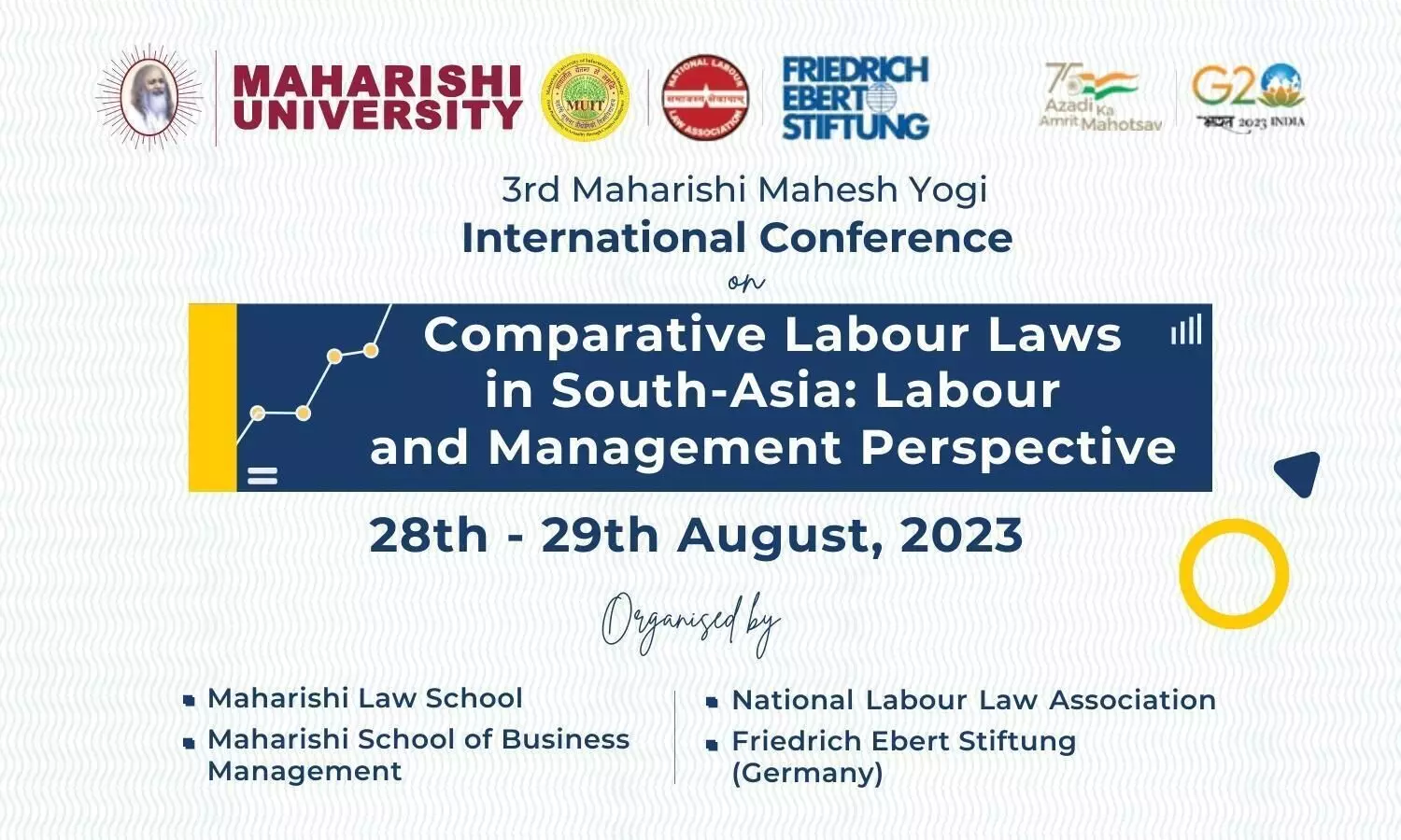 Maharshi University of Information Technology, Noida and National Labour Law Association, Delhi are organising the 3rd Maharishi Mahesh Yogi International Conference On Comparative Labour Laws in South-Asia: Labour and Management Perspective on 28 – 29 August 2023 in collaboration with Indian Industrial Relations Association, New Delhi (IIRA); Social Security Association of India, New Delhi (SSAI); International Society for Labour and Social Security Law, (ISLSSL); ILO (TBC); and FES-India (TBC); AIOE (TBC).