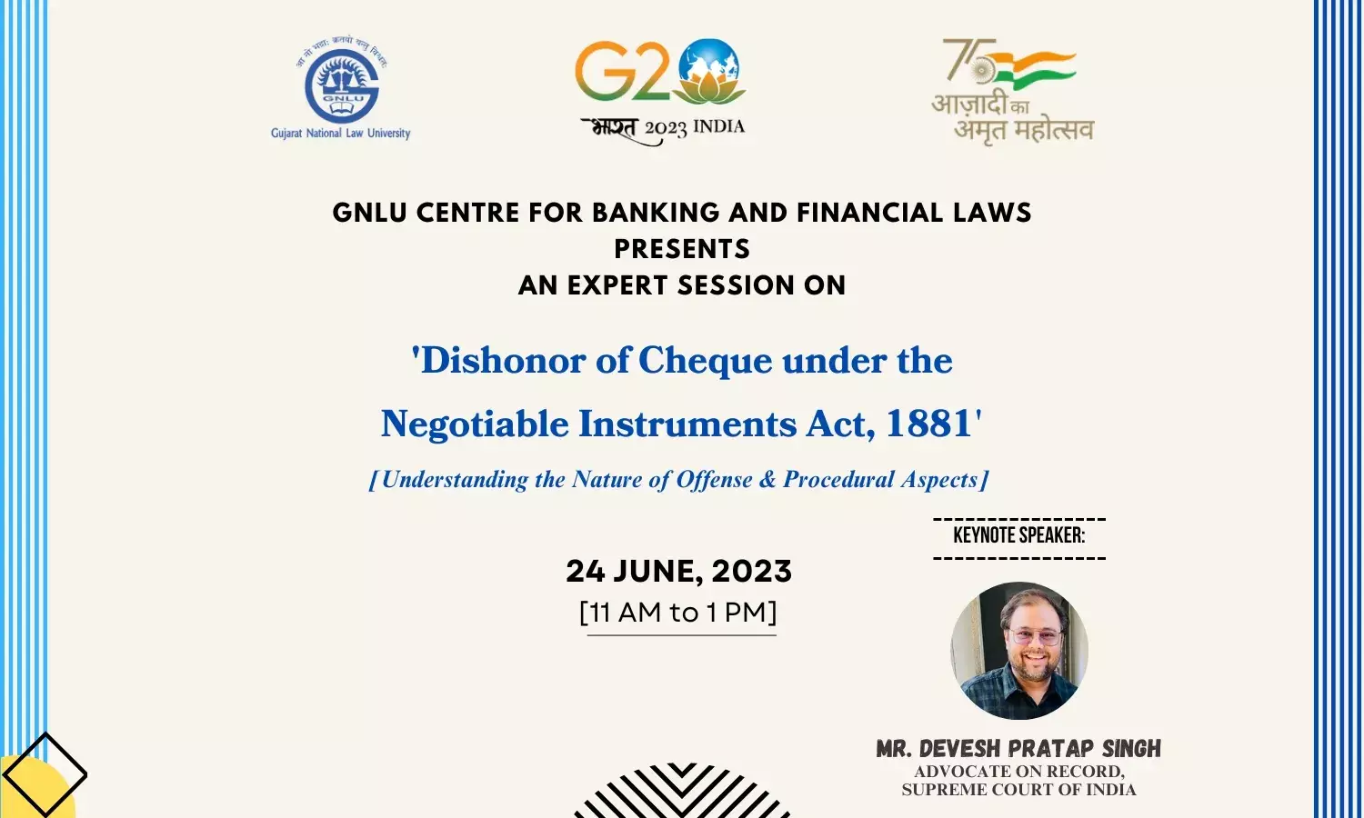 GCBFL is organizing an Expert Session on "Dishonour of Cheque under the Negotiable Instruments Act, 1881" on 24th June 2023 (Saturday) from 11.00 AM to 1.00 PM. The keynote speaker for this session is Mr. Devesh Pratap Singh, Advocate-on-Record, Supreme Court of India. You can find more details about this event given below: