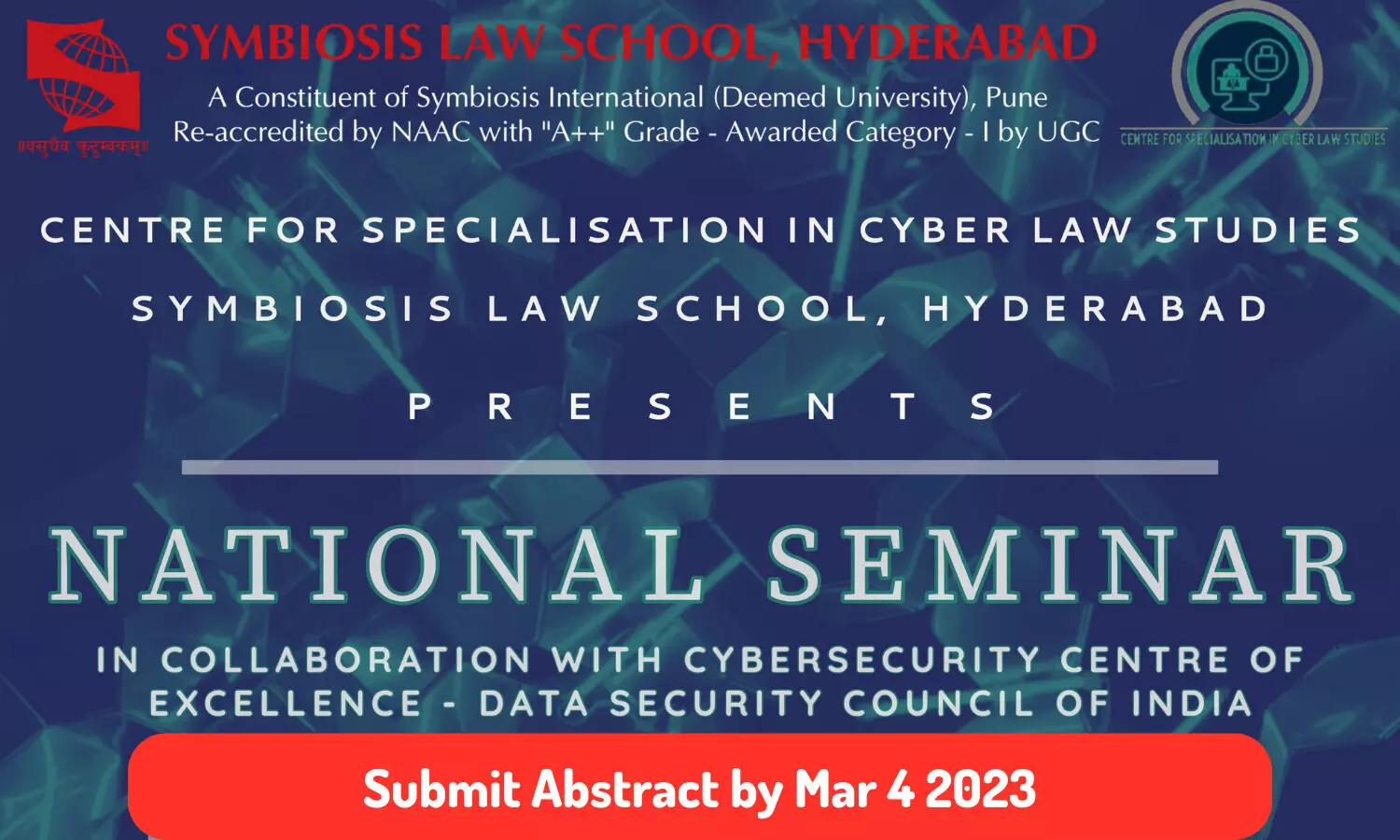 Call for Papers is being invited for National Seminar on Emerging Technological Trends in Cyber Law and Cyberspace Regulations by Symbiosis Law School, Hyderabad by Mar 15 2023.;