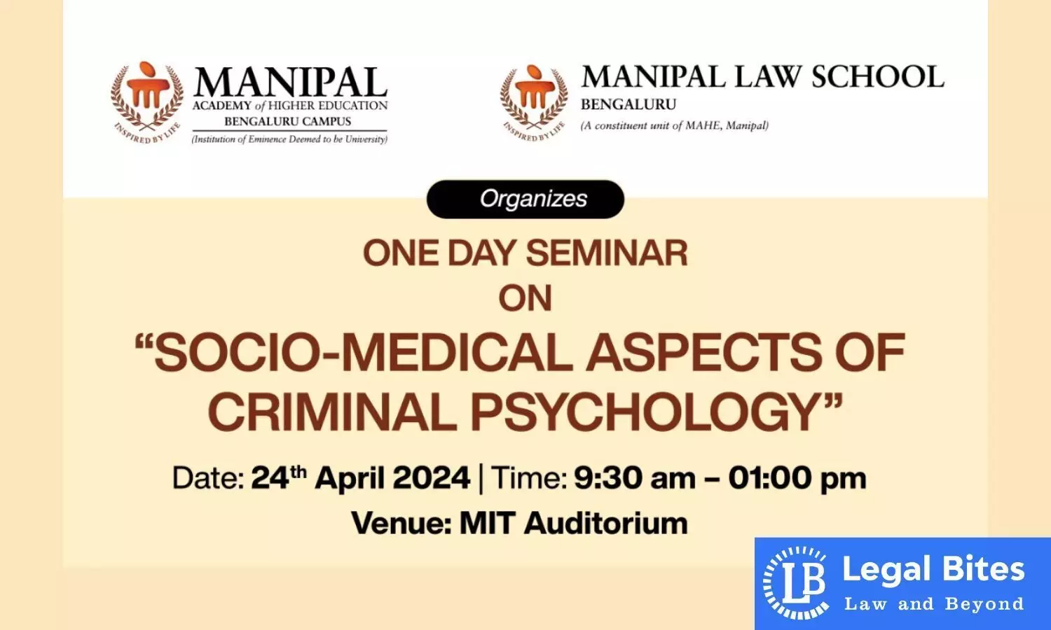Manipal Law School, MAHE, Bengaluru is organizing a panel discussion on 24th April 2024 in hybrid mode on the topic "Socio-Medical Aspects of Criminal Psychology” from 9:30 am– 02:30 pm.