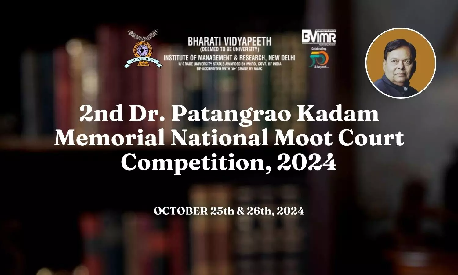 Moot Court Society, Department of Law, BVIMR is organizing 2nd Dr. Patangrao Kadam Memorial National Moot Court Competition 2024 from 25th October 2024 and 26th October 2024 at Bharati Vidyapeeth (Deemed to be University) Institute of Management & Research, Paschim Vihar, Delhi.