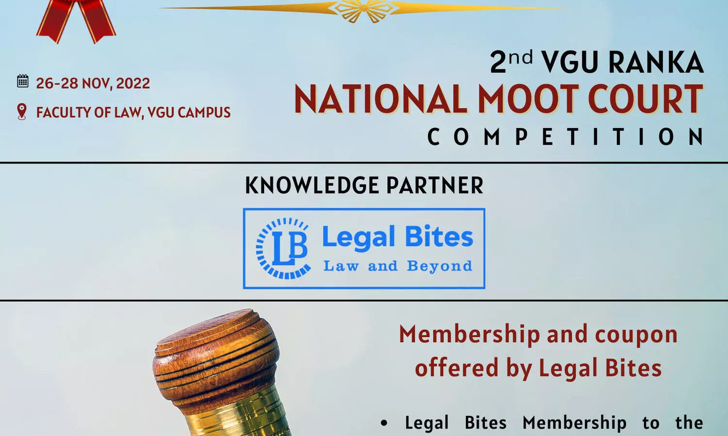 Faculty of Law, VGU in association with Ranka Public Charitable Trust in it's dedicated efforts towards growth and development of legal fraternity takes immense pride to announce it's 2ⁿᵈ VGU Ranka National Moot Court Competition, 2022 scheduled to be held in offline mode from 26ᵗʰ-28ᵗʰ November, 2022. In this regard, we solicit your cooperation by taking part in the National Moot Court Competition.