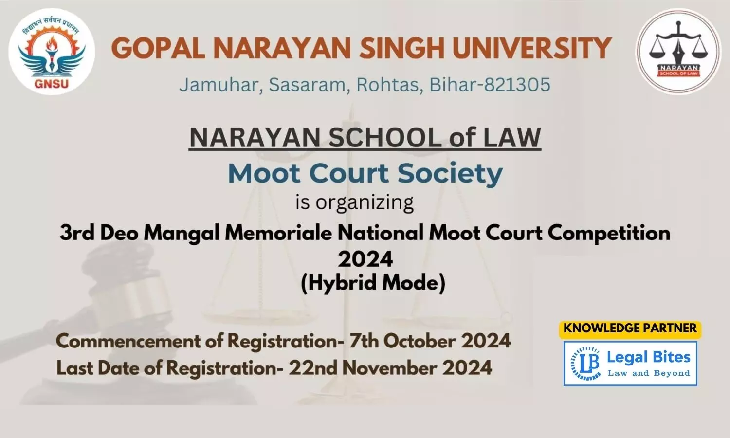 Moot Court Society, Narayan School of Law, Gopal Narayan Singh University proudly announces its 3rd Deo Mangal Memorial National Moot Court Competition, 2024 from 29 November to 15 December 2024 in Hybrid Mode.