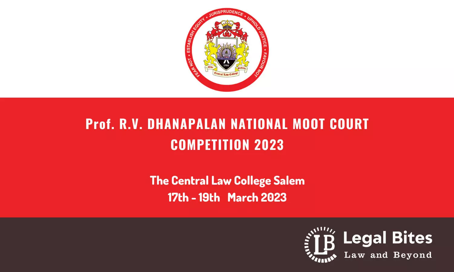 The Central Law College Salem is organizing III National Moot Court Competition from 17th - 19th March 2023 namely Prof. R.V. Dhanapalan National Moot Court Competition.;