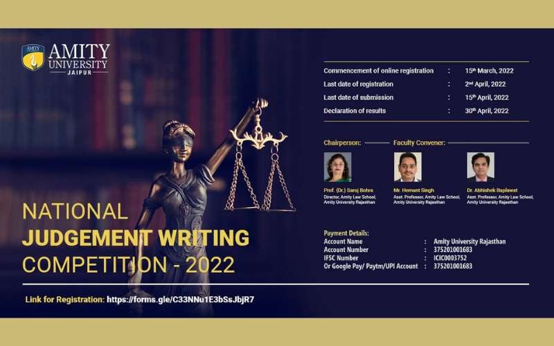 Amity University Rajasthan is inviting registrations for AUR National Judgment Writing Competition 2022 before 10th April, 2022.