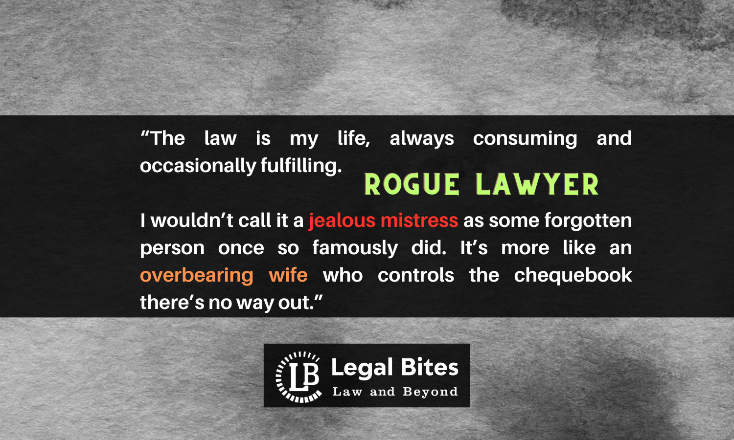 “The law is my life, always consuming and occasionally fulfilling. I wouldn’t call it a jealous mistress as some forgotten person once so famously did. It’s more like an overbearing wife who controls the chequebook there’s no way out.”