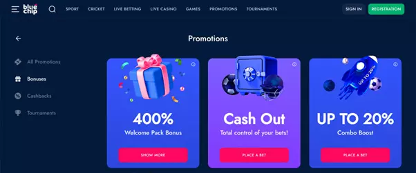Also, do not forget about greeting bonuses provided by Bluechip casino. Both bettors and gamblers can enjoy casino promotions. Registering players will get a 400% deposit bonus package. Bluechip offers bonuses that are subject to reasonable wagering and can be credited immediately to your main deposit.