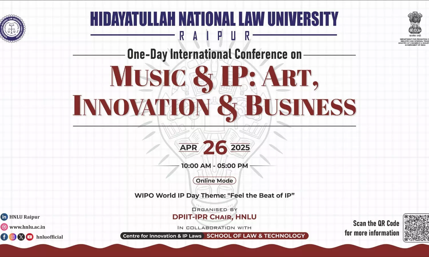 Centre for Innovation and IP Laws (CIIPL) at Hidayatullah National Law University, Raipur, is delighted to announce the Virtual International Conference on "Music and IP: Art, Innovation & Business" to celebrate World Intellectual Property Day on 26th April 2025.