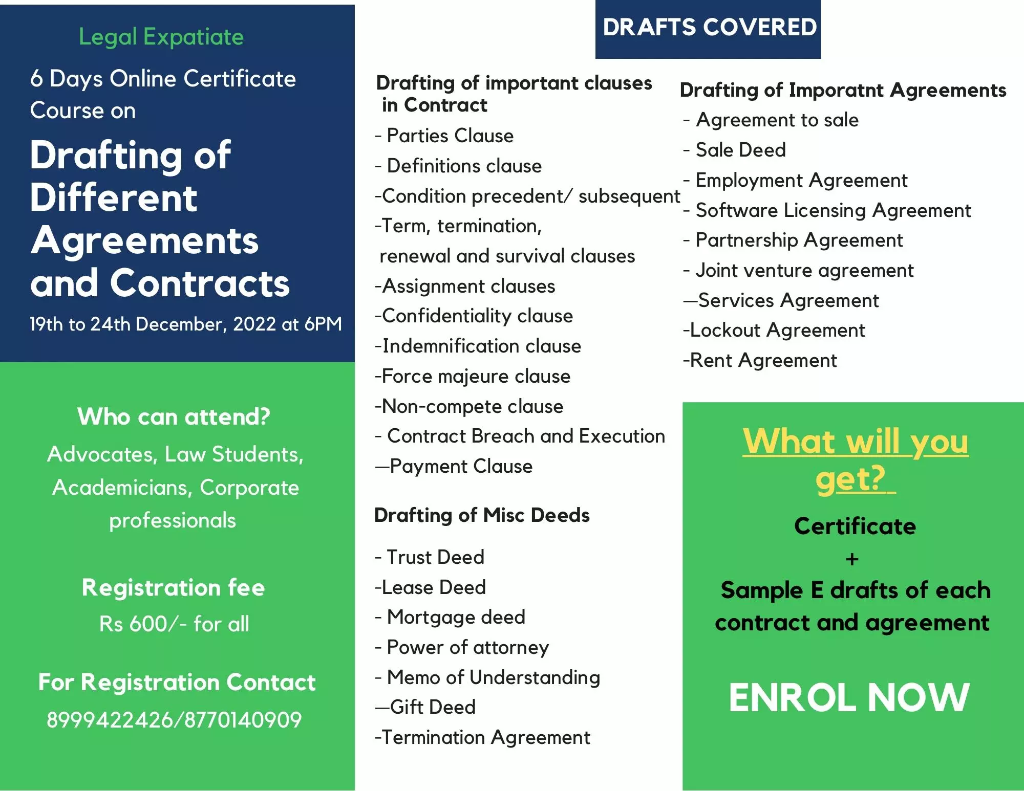 6 Days Online Workshop on Drafting of Agreements And Contracts from 19th to 24th Dec, 2022 | Legal Expatiate