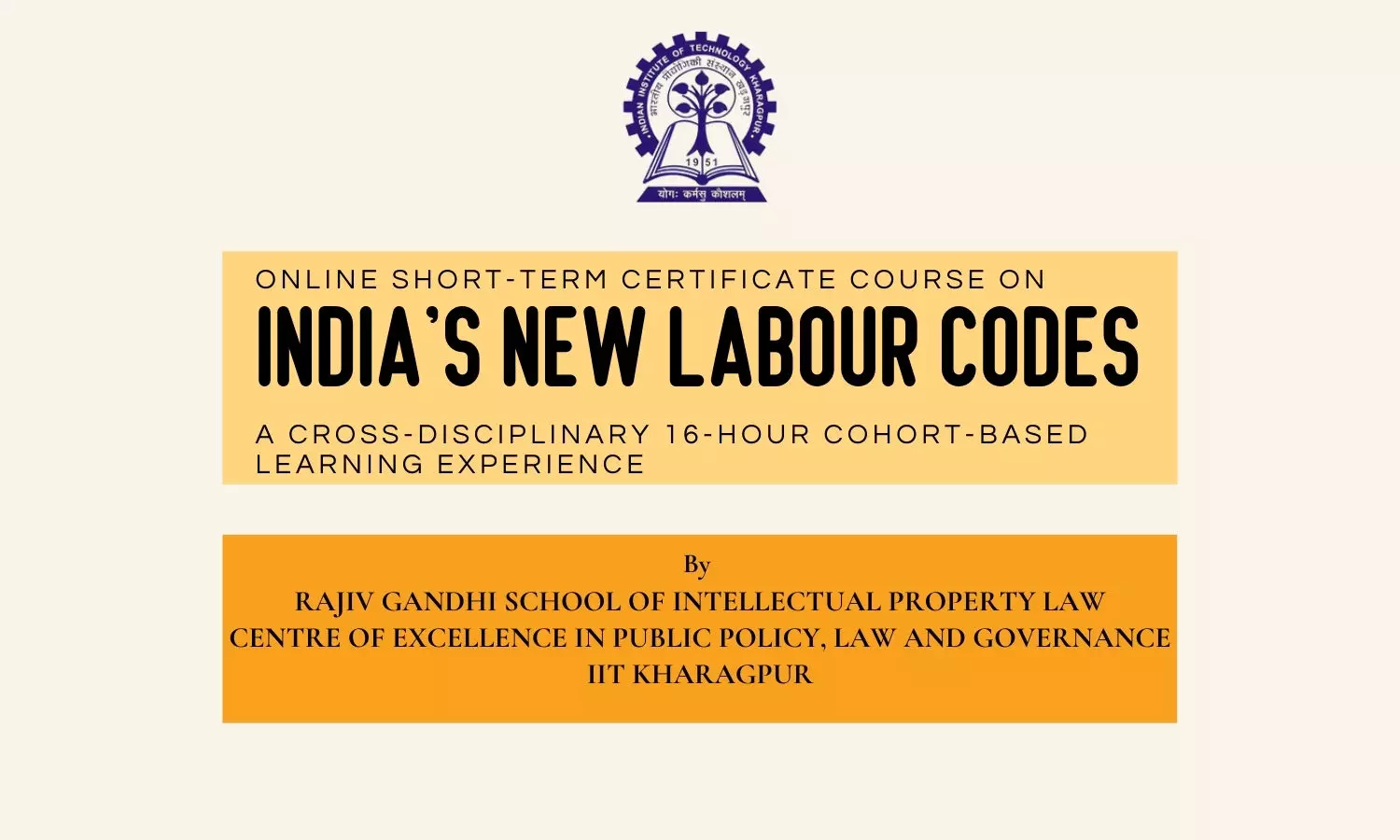 Rajiv Gandhi School of Intellectual Property Law (RGSoIPL), IIT Kharagpur, in association with the Centre of Excellence in Public Policy, Law & Governance (CoEPPLG), is organizing an online short-term certificate course on India’s New Labour Codes. The course is designed as a cross-disciplinary, cohort-based learning experience, focusing on both the legal framework and public policy, compliance, and governance perspectives.