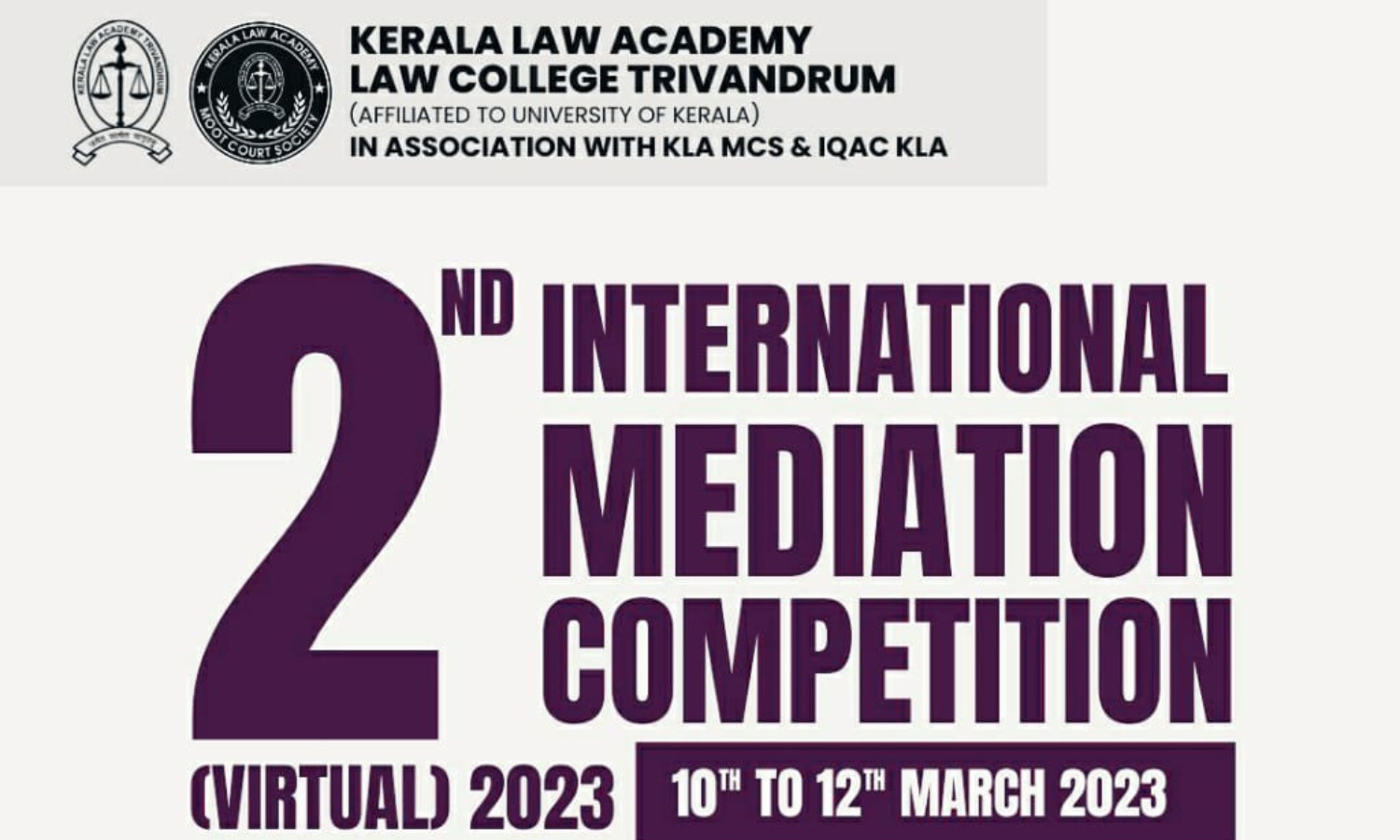 Amidst the COVID-19 pandemic, the 2nd International Mediation Competition hosted by the Kerala Law Academy will be held via virtual mode on 10th March 2023 from the Kerala Law Academy Campus, Peroorkada, Thiruvananthapuram, Kerala. The competition is conducted through the online platforms Zoom.